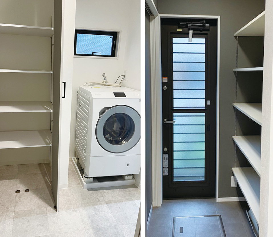 さらにおすすめなのが「収納が多い家」。階段の傾斜を緩く、広くすることで安全性が高まり、階段下のスペースをシューズルームと広いクローゼットにすれば、外で使うものを部屋に持ち込まなくなり、衛生面も高まって快適な暮らしが維持できます。また玄関横にパントリールームを配置すれば、買い物から帰ってきてすぐに食料品や日用品を収納でき、反対のドアを開ければキッチンに繋がっていて、料理に集中できる環境になると大変好評です。