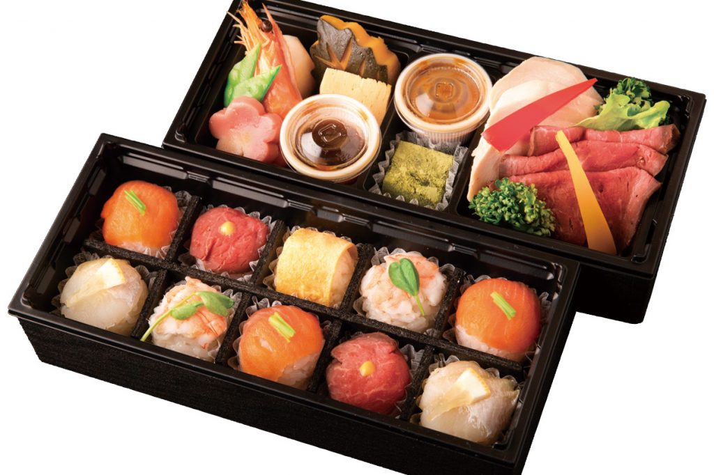 この春に新登場。ひと口サイズの手まり寿司は女性に人気。ローストビーフ、サラダチキン、野菜の煮物など味わいもボリュームも大満足