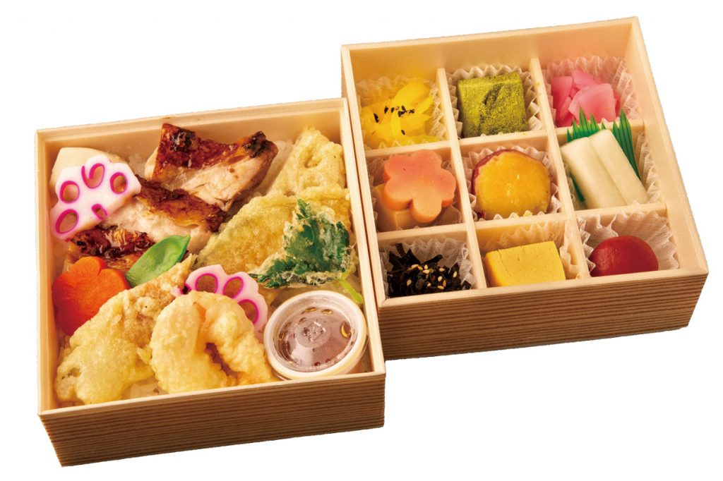 この春、新登場のお弁当。ご飯の上にたっぷりの天ぷらと鶏照焼。ひと口サイズのおかずと一緒に満足できて、お手頃価格も嬉しい