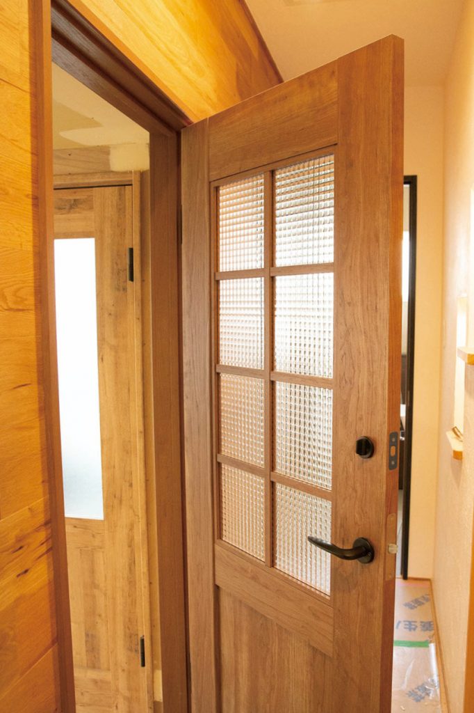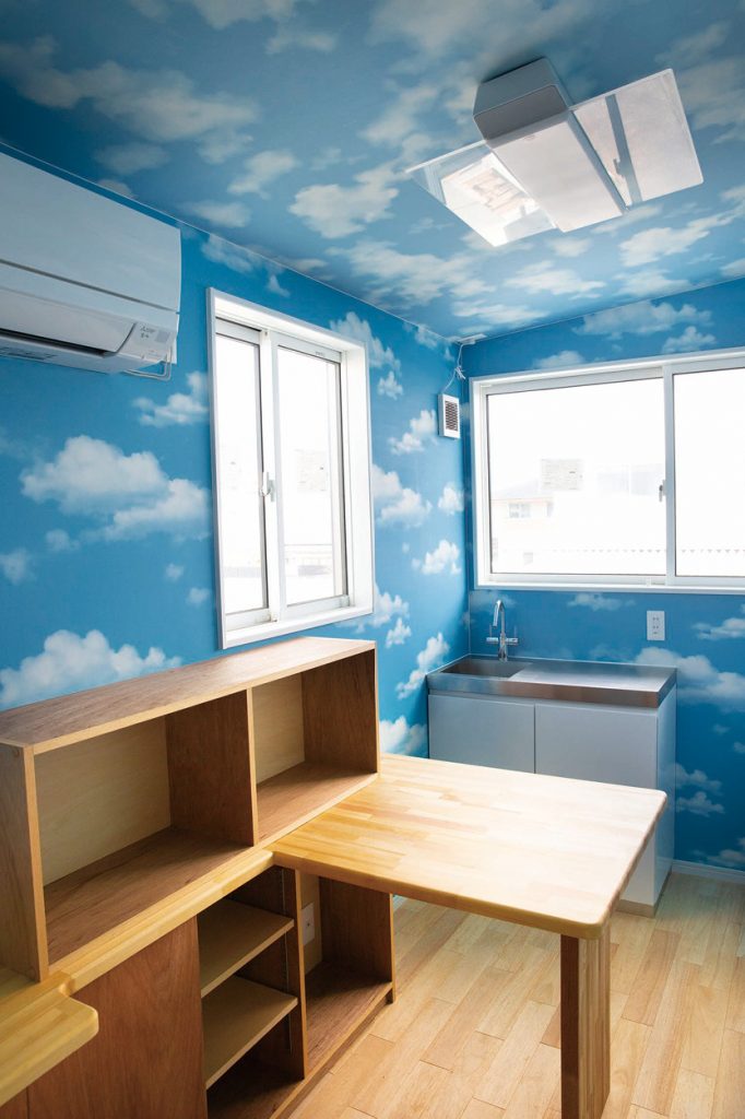 消臭効果がある珊瑚の天然石を壁に使用。全てのドアが異なり、天井と壁が青空など全てが家づくりの参考になる