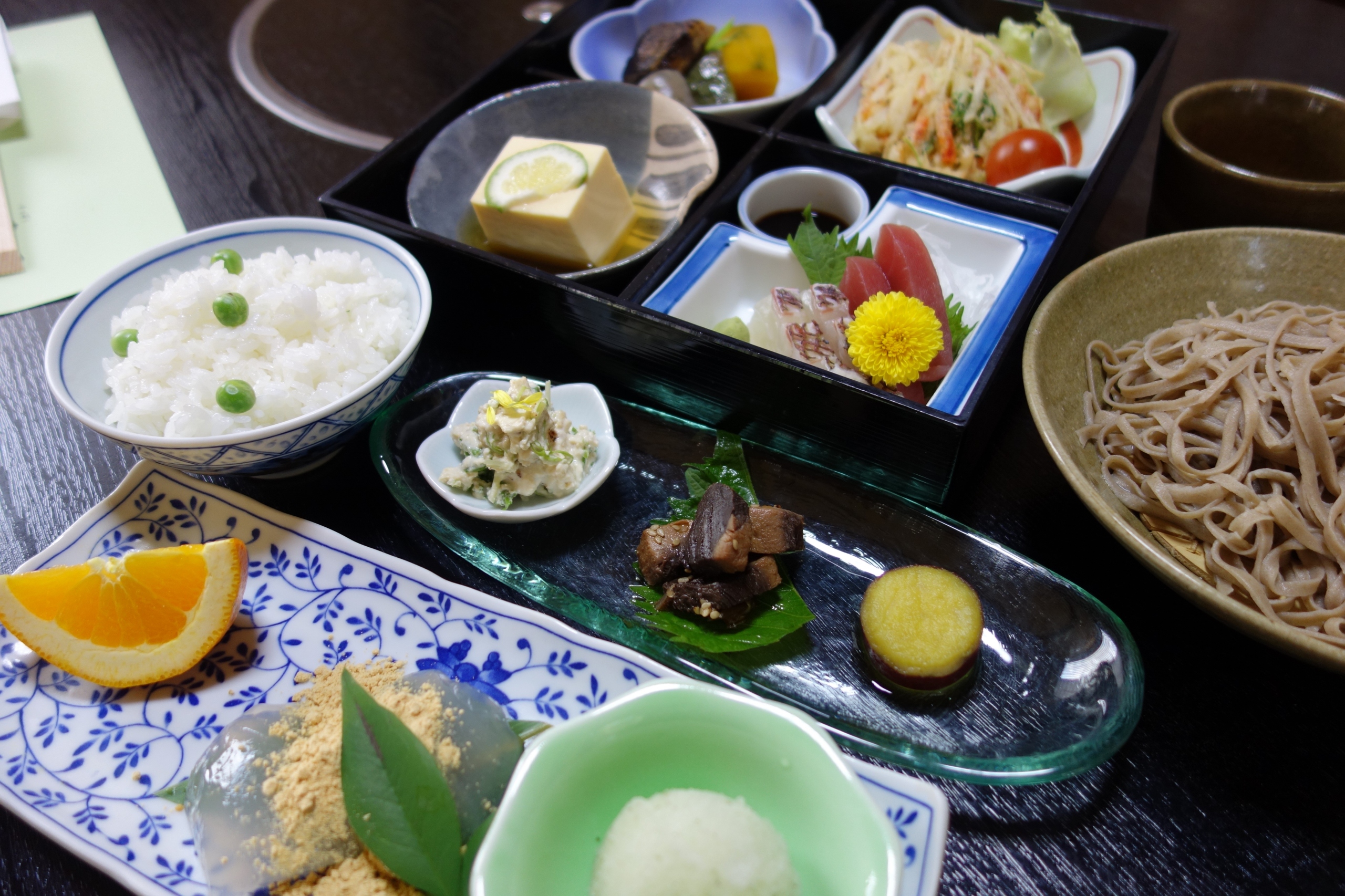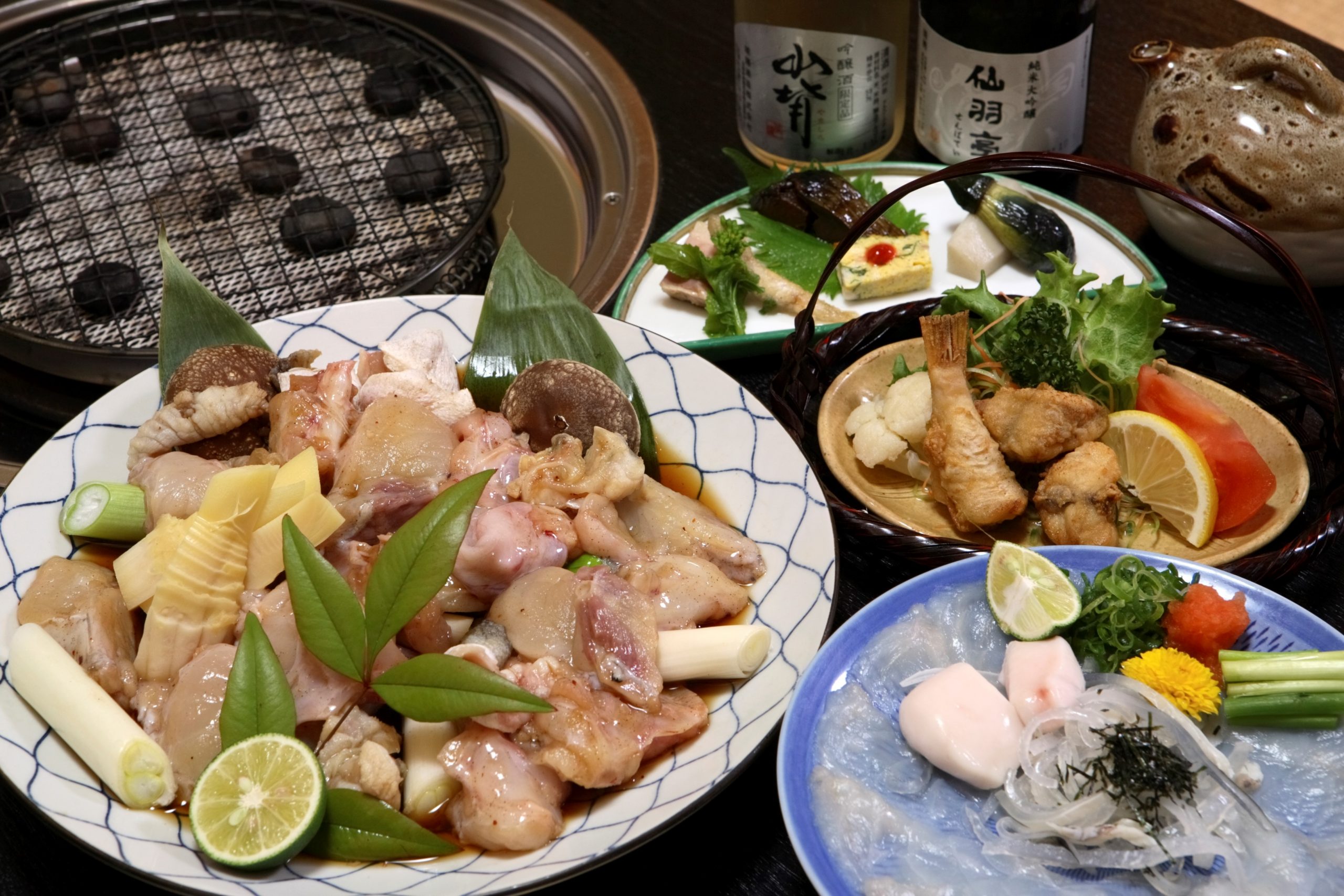夏は「鱧しゃぶ」を中心とした鱧料理を、秋からは「焼きふぐ」や「てっちり」などのふぐ料理が楽しめる。ランチでは2代目が毎朝手打ちする昼の蕎麦遊膳が好評。