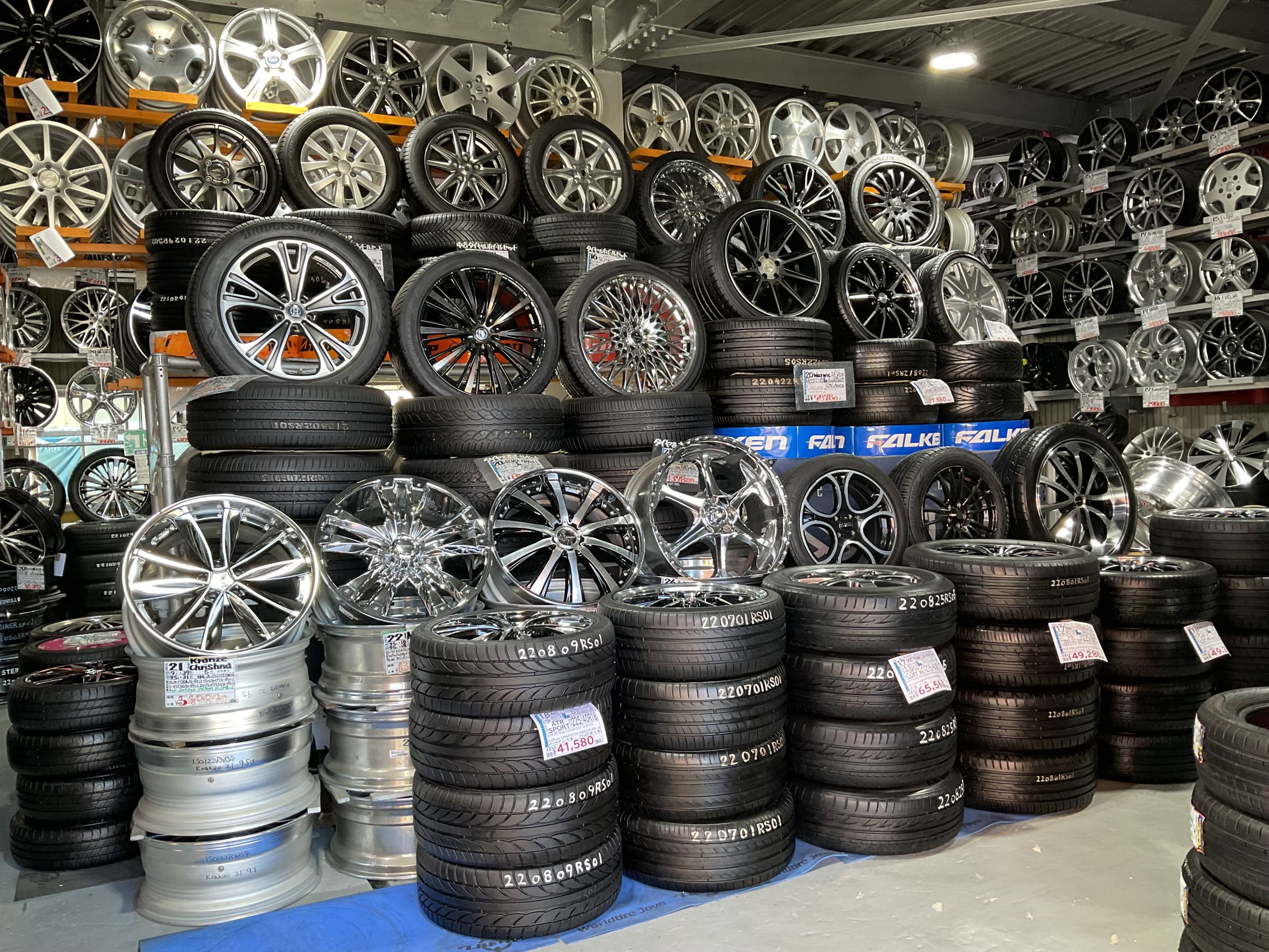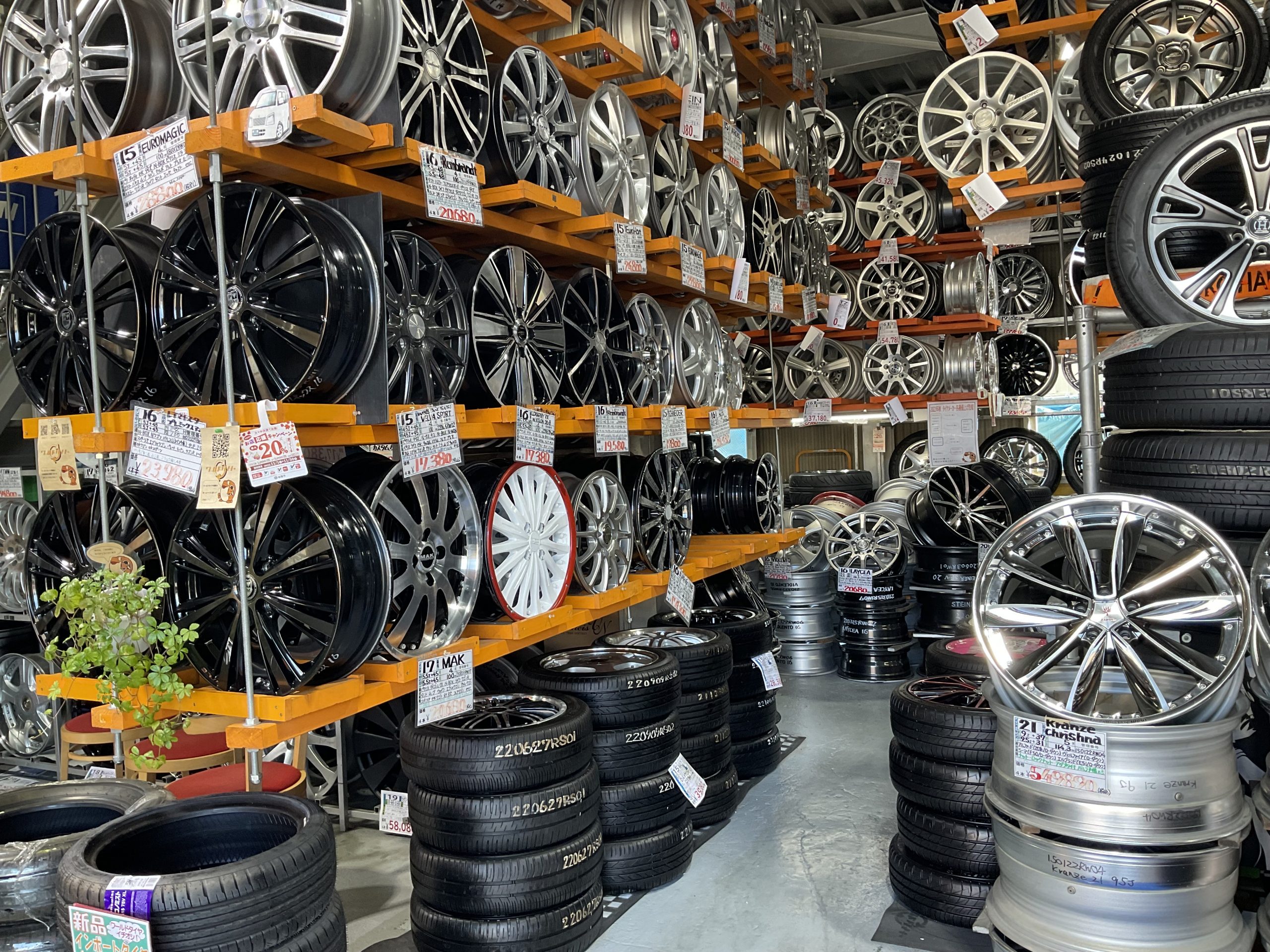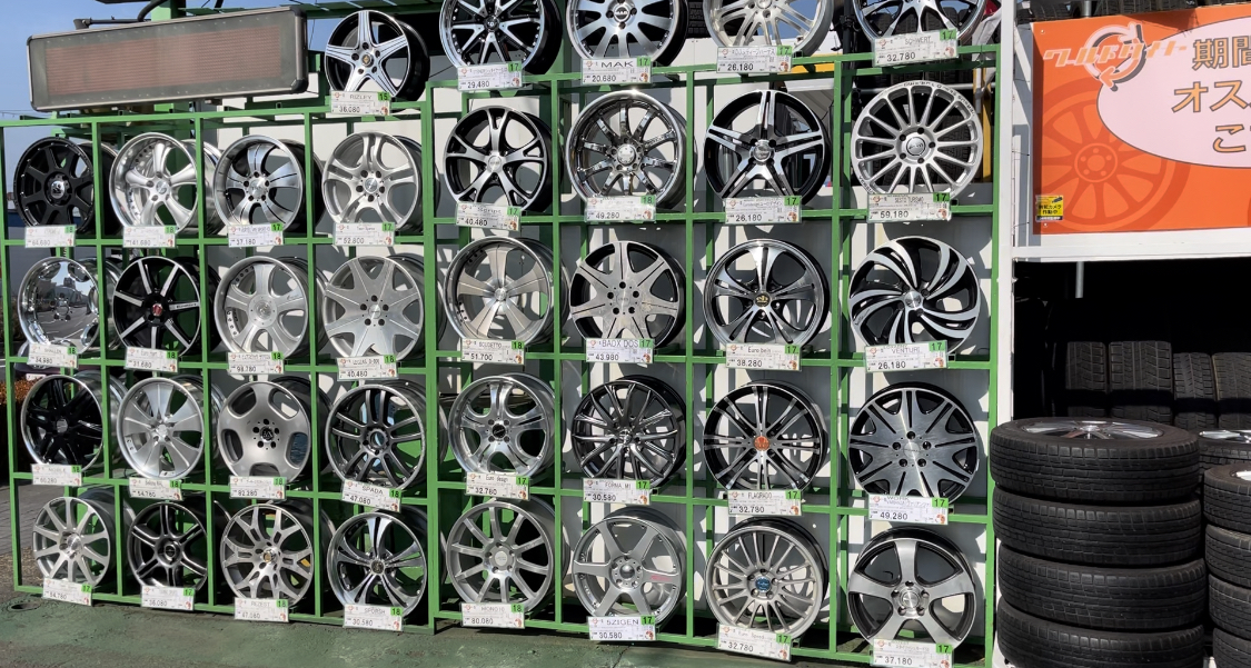 中古タイヤ・ホイールの専門店。軽からワンボックス、外国車まで、様々な車種のホイールが約3500セット揃う。実物がチェックできると府外からも多く来店。クリーニングした状態の良いものばかりで、激安なので費用を抑えてドレスアップがしたい方におすすめ。新品タイヤも他店に負けない価格で販売し、タイヤ交換も大歓迎。
