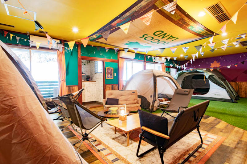 テント、タープ、テーブル、イスなどロゴスのアウトドアギアが室内にセットされたホテル。テント部屋やタープ部屋などがあり、中庭テラスで「プライベートBBQ」ができる部屋が人気です。トイレやバスは共用でキャンプサイトのような部屋では、よりキャンプに近い過ごし方が体験できる。棟内にロゴスショップやロゴスカフェも併設。