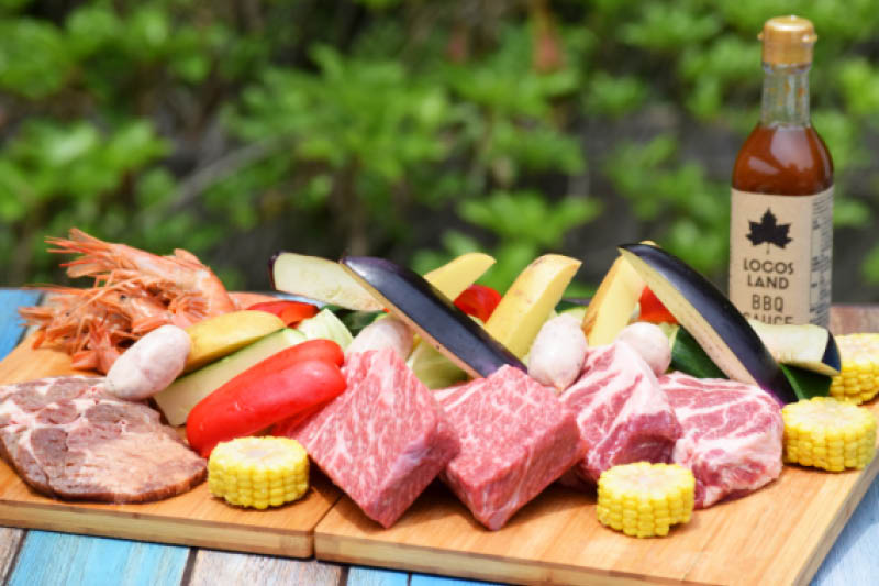 「LOGOS BBQスタジアム」は青空の下、1区画あたり最大8名でBBQをすることができます。ゆったり開放感のある全26区画で、食材、LOGOSアイテム、BBQソースまで一式を用意してもらえるので、手ぶらで楽しめる。本格的に自分たちでバーベキューを楽しみたい人のために、食材の持ち込みプランもあります。