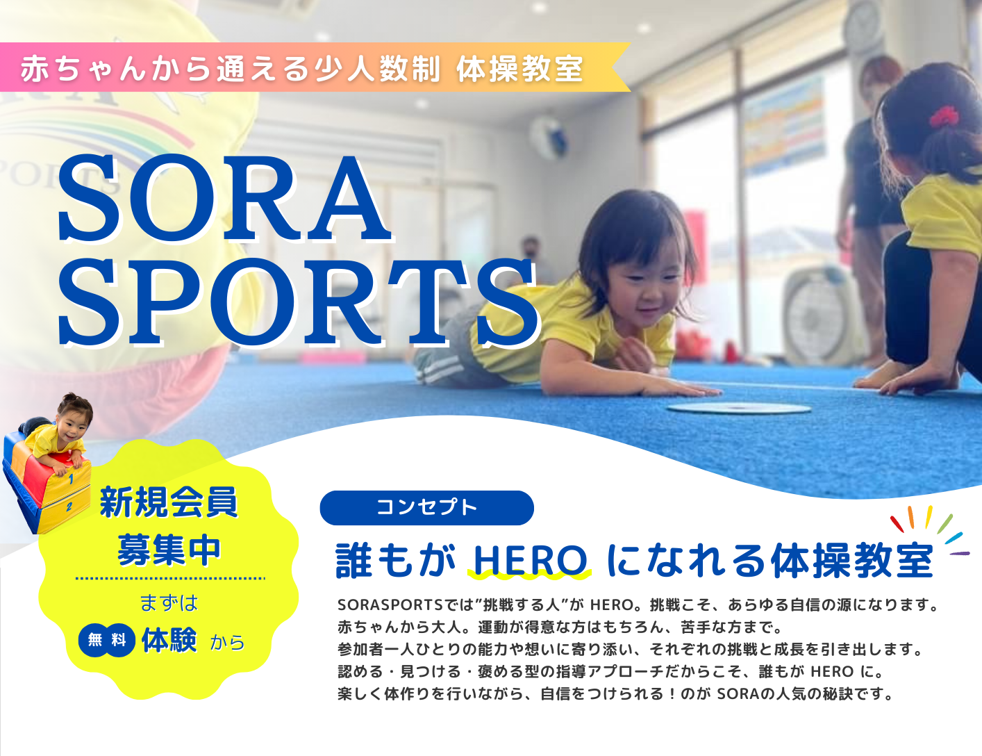SORASPORTSでは「挑戦する人」全てがHERO! 挑戦こそが、あらゆる自信に繋がります。 少人数制レッスンで、認める・見つける・褒める型の指導アプローチを展開、赤ちゃんから大人、運動が得意な方はもちろん、苦手な方、全ての方の能力や想いに寄り添い、挑戦と成長を引き出します!